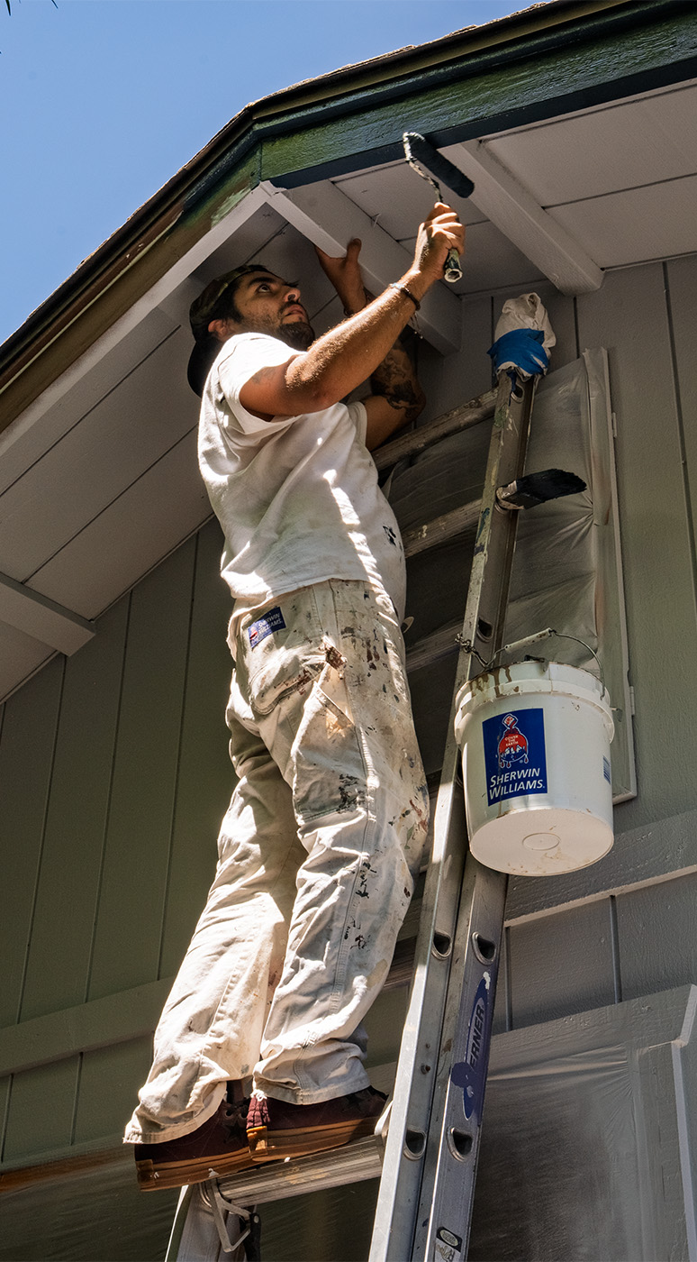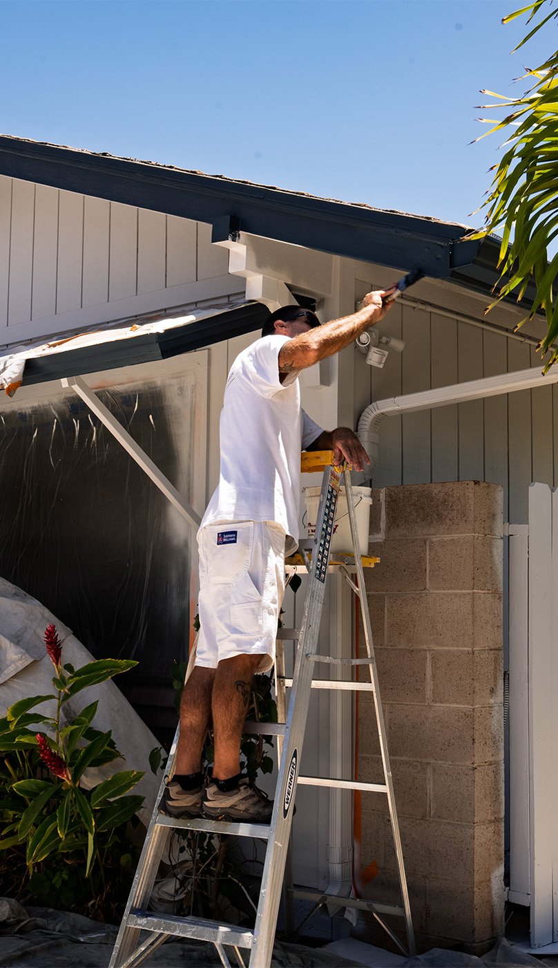 97 Painting Maui, Painter on ladder painting house gutters