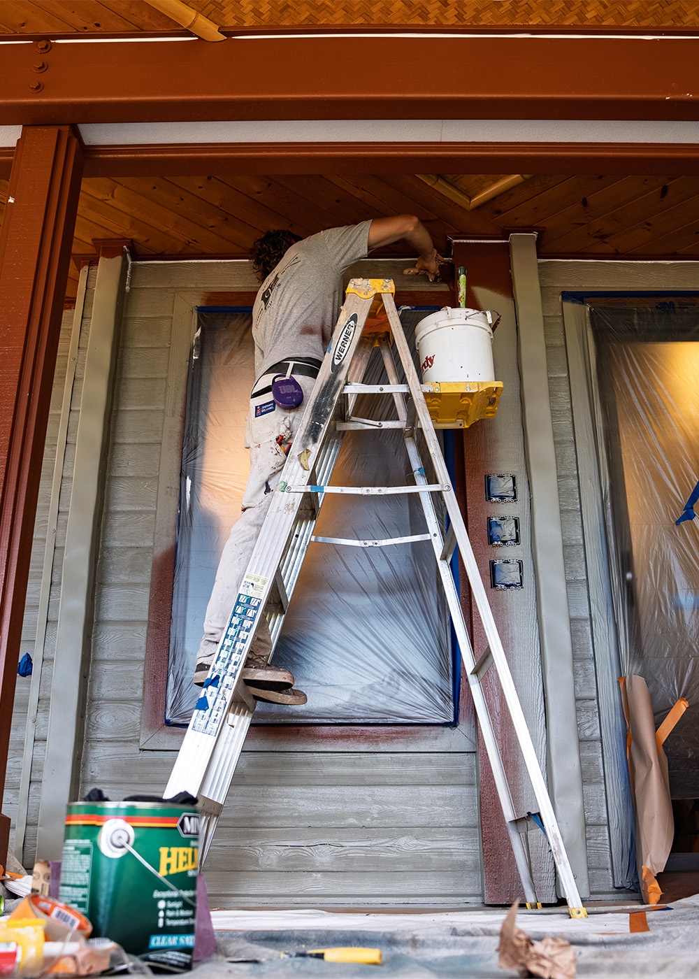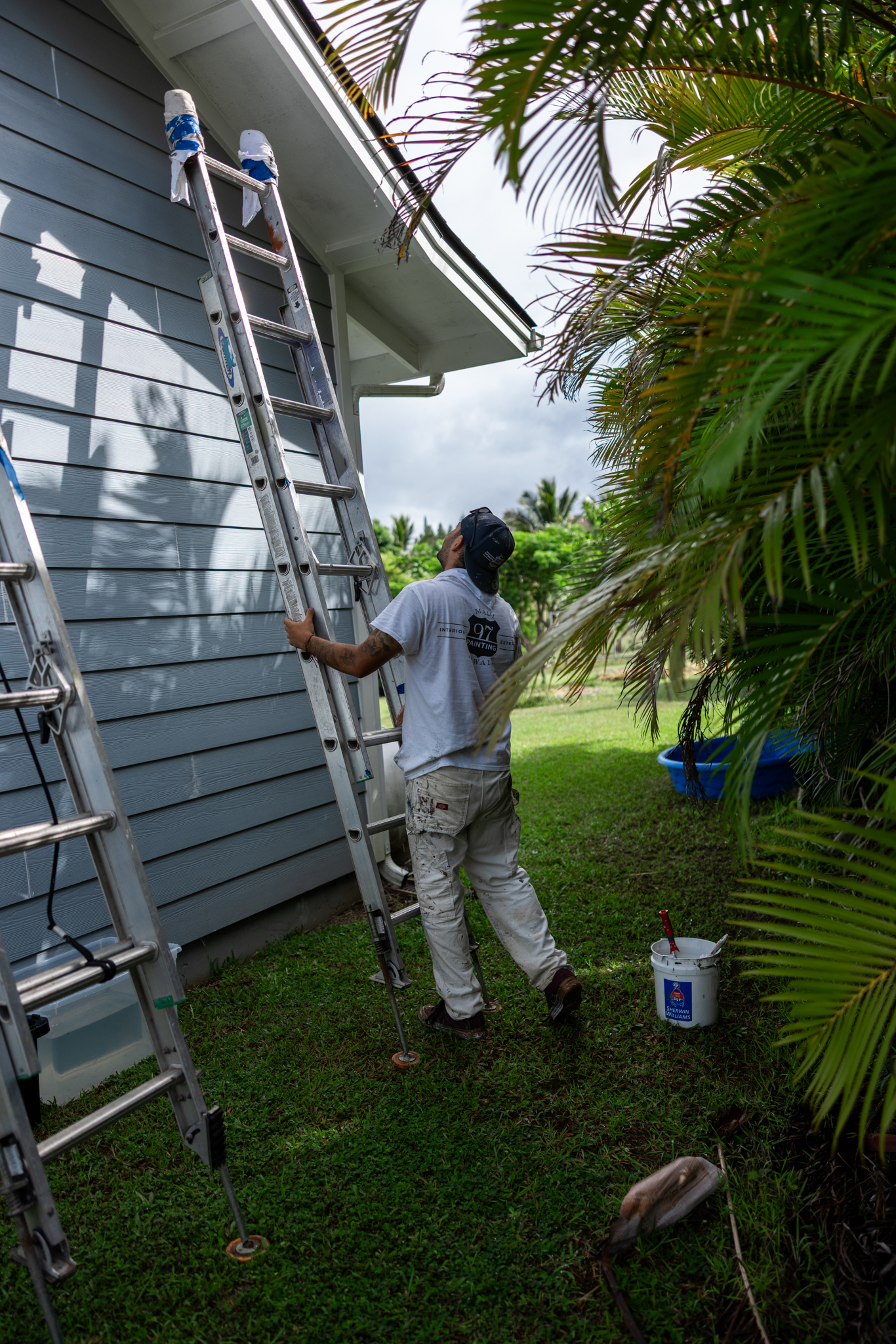 97 Painting Maui, Painter on ladder painting house exterior