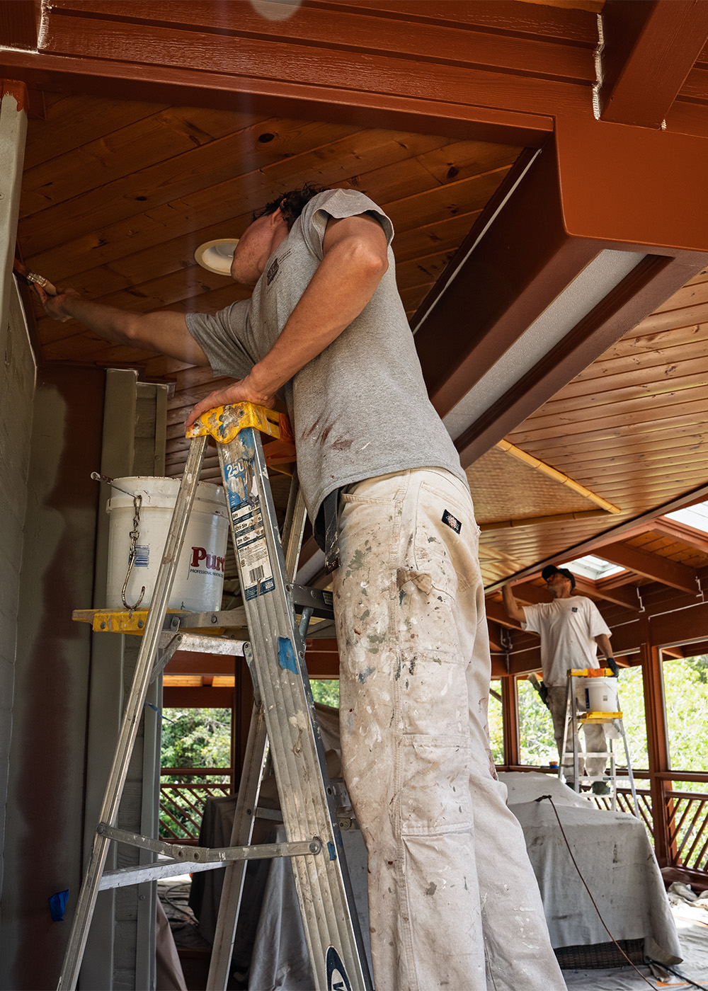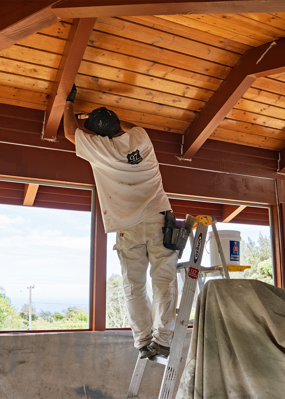 97 Painting Maui, Painter on ladder painting ceiling